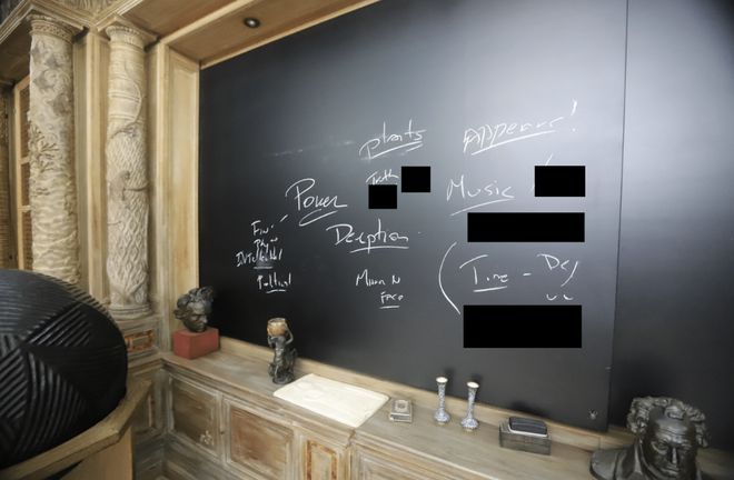 最新公布的图像展示的是一些外部建筑和内部设施,包括游泳池区域、一些卧室和浴室、一间配有大书桌和黑板的图书馆、一间带有内置长凳的大理石淋浴房等等。在室内的一面墙上,挂着一些较为诡异的面具。房间内还有一部老式的松下牌座机,座机上标注有一些人名,其中一些敏感的人物名字在公布的照片中被涂黑隐藏。