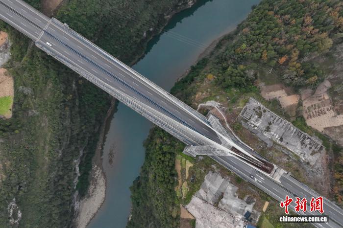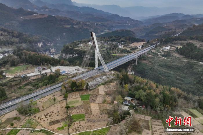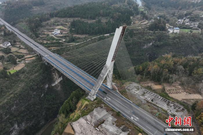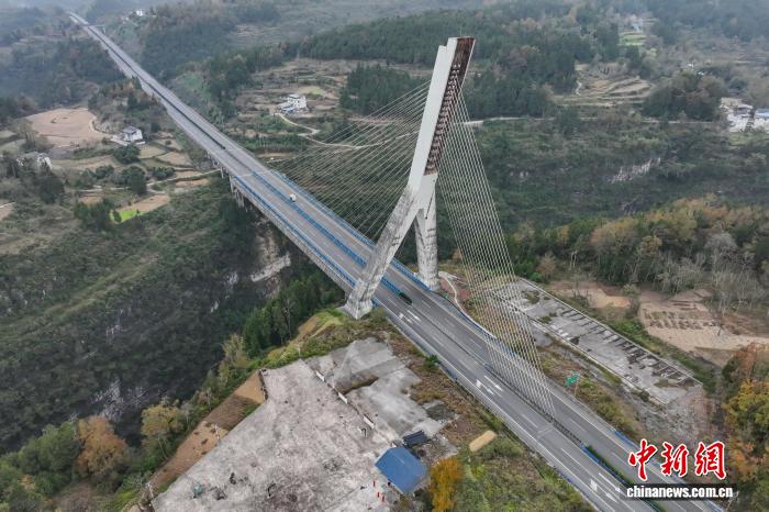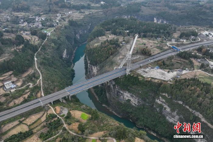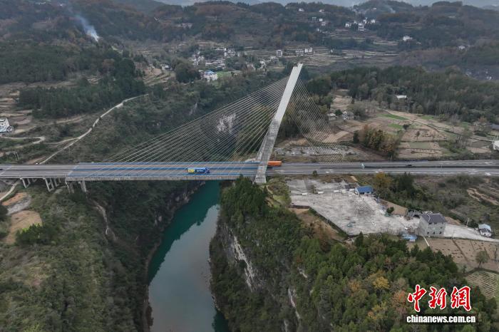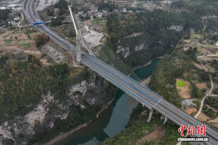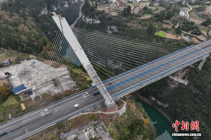 12月4日,航拍镜头下的贵州芙蓉江大桥224根斜拉索似一根根琴弦,宛如在芙蓉江上方拉起了一把“空中竖琴”。该大桥位于贵州省遵义市正安县境内,全长340米,主跨170米,主塔为倒Y形塔,总高98.5米,是中国首座地锚式单塔斜塔混凝土斜拉桥。(无人机照片)中新社记者 瞿宏伦 摄