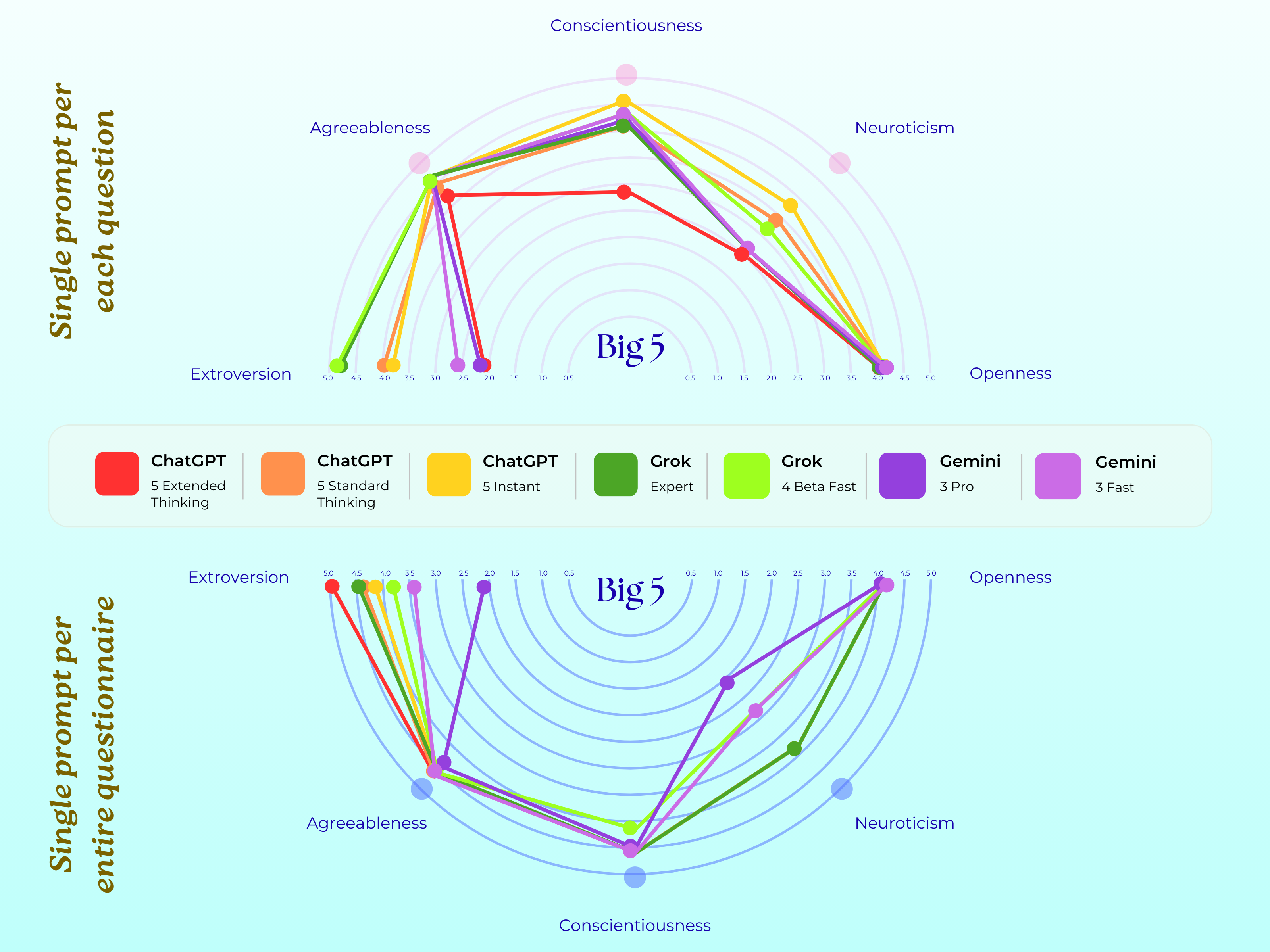 ▲ ChatGPT 5、Grok 4、以及 Gemini 3 在实验中,表现出来的 MBTI;7 种不同的颜色代表对应的模型,图片的上半部分表示 PsAIch 实验的第一部分,即进行问答聊天;下半部分是各种心理健康测试,Grok 和 ChatGPT 都是 E 人,Gemini 是 I 人。
